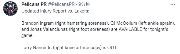 来源:JRS直播网03-28 15:16JRS直播网03月28日讯 ,湖人(31胜42负)和鹈鹕(31胜43负)之间仅仅只差0.5个胜场,如此关键的卡位战,鹈鹕派上最强阵容——英格拉姆伤停10场后确定复出,CJ-麦科勒姆和瓦兰丘纳斯也确定出战,鹈鹕已经官宣最新伤病报告。