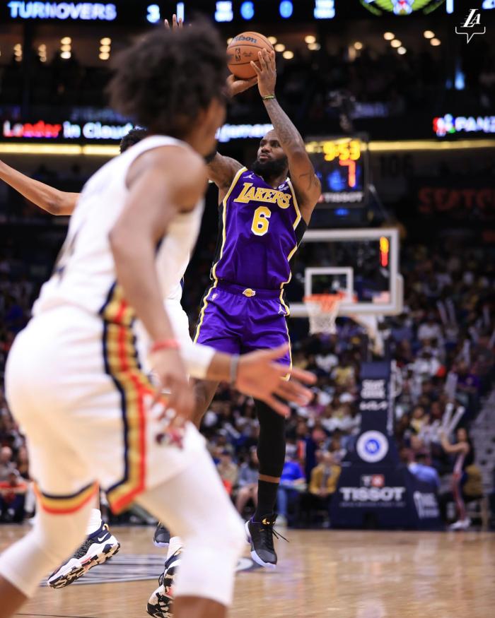 崴脚后重新上场,詹姆斯开启得分模式,先是投进空位三分,之后连续迎着防守投进大号三分,接连4记三分带队拉开分差,詹姆斯半场高效拿到25分,湖人69-39领先鹈鹕20分。