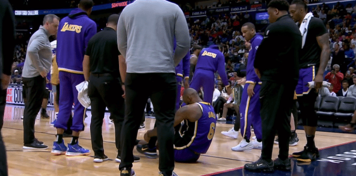 第二节,詹姆斯打满12分钟,上场后先是传球组织进攻,可队友手感不佳,鹈鹕追到3分;詹姆斯更是遭遇惊魂时刻,不慎踩到海斯的脚导致脚踝90度扭伤,老詹痛苦倒地,之后绑紧鞋带重新上场,崴脚仍不下火线。