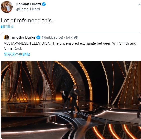 来源:JRS直播网03-28 14:59JRS直播网03月28日讯 ,在奥斯卡颁奖典礼上,发生意外打人事件,著名影星威尔-史密斯掌掴主持人克里斯-洛克,冲突热搜引爆社交网络;湖人躺枪,多名NBA球员发推惊叹以及看热闹。