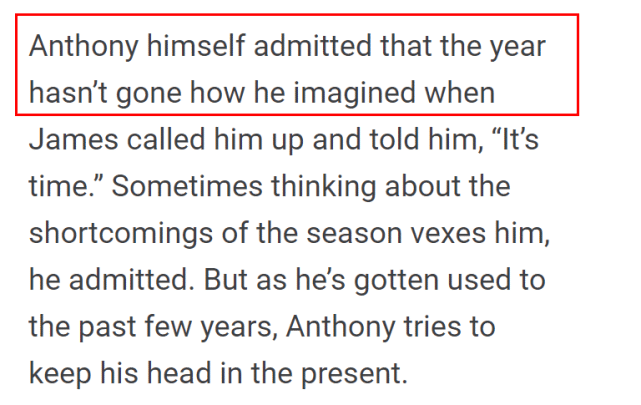 安东尼承认湖人这个赛季的进展,显然不如他在接到詹姆斯招募电话时的预期和想象。在生涯这个时刻联手詹姆斯,他当然想要的是一个总冠军,而现在来看,这个目标离他越来越远。不过,安东尼到底是经过风浪的人,他说无论什么情况,都会保持平稳的心态。当然,他也仍然对未来有所憧憬,他希望浓眉归来后球队能打得更好。