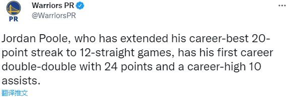来源:JRS直播网03-26 15:40JRS直播网03月27日讯 ,勇士客场110-121不敌老鹰,库里因伤继续休战,普尔全场22投8中、三分13中4拿到24分10助攻4篮板,上下半场判若两人,上半场13中8拿到22分,下半场9投0中仅靠罚球拿到2分;不过普尔创纪录——连续12场20+继续刷新生涯纪录,仅次于里克-巴里勇士队史第二年轻达成如此成就的球员,10次助攻创生涯新高,生涯首次20+10两双。