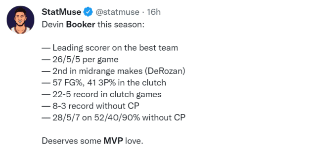 击败掘金一战前,美媒StatMuse也晒出了布克本赛季的表现:他是联盟战绩最好球队的头号得分手;场均26+5+5;中投命中数联盟第二;关键时刻投篮命中率57%,三分命中率41%;关键比赛22胜5负,没有保罗在身边取得8胜3负,没有保罗期间的数据是28+5+7,投篮命中率52%,三分命中率40%,罚球命中率90%。最终,StatMuse得出的结论是布克值得进入MVP的讨论。