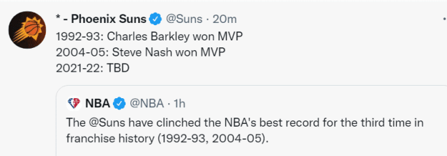 太阳官方社媒也在为布克当选MVP造势。NBA官方在太阳锁定最佳战绩后写道:“这是太阳队史上第三次打出联盟最佳战绩,过去两次是1992-93赛季和2004-05赛季。”太阳官方社媒转发这一动态,并写道:1992-93赛季的MVP是巴克利,2004-05赛季是纳什,两个赛季都是太阳球星当选。2021-22赛季的MVP仍在待定中,但太阳官媒举例的意思不言而喻。他们认为,布克应该成为本赛季的MVP。