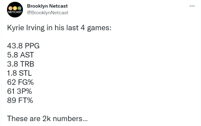 过去4场比赛,欧文状态火热,场均贡献43.8分5.8助攻3.8篮板1.8抢断,投篮命中率62%,三分命中率61%,罚球命中率89%。美媒感慨:“这些简直是电子游戏的数据。”