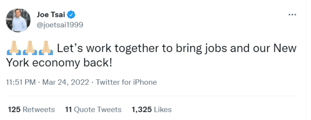 篮网老板蔡崇信也第一时间发推写道:“让我们共同努力,恢复就业和纽约经济!”