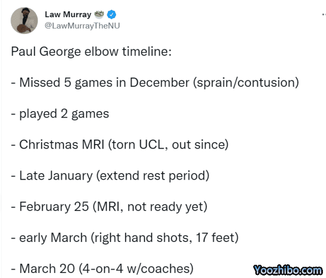 去年12月份因扭伤挫伤缺席了5场比赛,复出打了2场比赛后,在12月25日接受了核磁检查,缺阵至今。他在1月下旬复查确定要休息更多的时间,2月25日又接受核磁检查,证明他还没做好准备。3月初,他开始进行右手投篮训练。3月20日获准参加4对4的训练,而今天,他终于参加了球队合练,恢复进入新的阶段。赛季至今,乔治只打了26场比赛,场均24.7分7.1篮板5.5助攻。