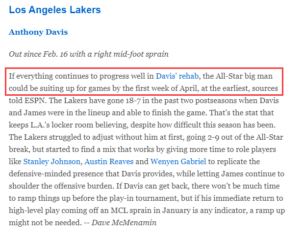 曝浓眉复出时间!预计四月第一周回归,助詹姆斯湖人冲击季后赛