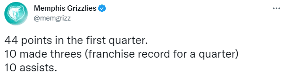 灰熊主场133-103大胜步行者30分喜提三连胜,莫兰特因伤继续休战,因右膝扭伤将在2周后复查;灰熊51胜23负继续排名西部第二,莫兰特缺席时灰熊16胜2负,疯狂一战创纪录,单节投进10记三分创新的队史第一纪录,全场投进21记三分,成联盟第二支锁定季后赛的球队。