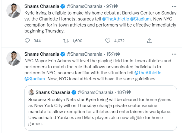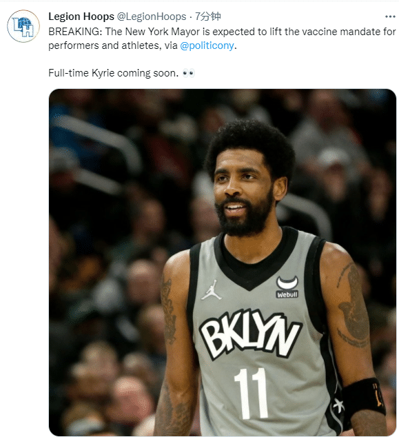 篮网迎来重大利好,据名记shams报道,布鲁克林篮网队球星凯里-欧文将获准参加主场比赛的资格,因为纽约市将在周四改变私营部门的疫苗规定;欧文终于能全职出战,主场首秀日期确定,全职出战助杜兰特冲击总冠军。
