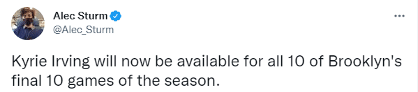 本赛季,欧文一度因拒绝接种疫苗而被篮网无限期禁赛,在赛季遭遇疫情侵袭时,篮网允许欧文归队但只能参加客场,之后获得坐在替补席观战的资格,不过因进入球队更衣室,篮网被联盟罚款5万美元;如今常规赛最后阶段,欧文即将获得参加主场比赛的资格,这意味着欧文可以出战篮网最后10场比赛,3月28日篮网主场对阵黄蜂,这将是欧文在篮网主场的赛季首秀。