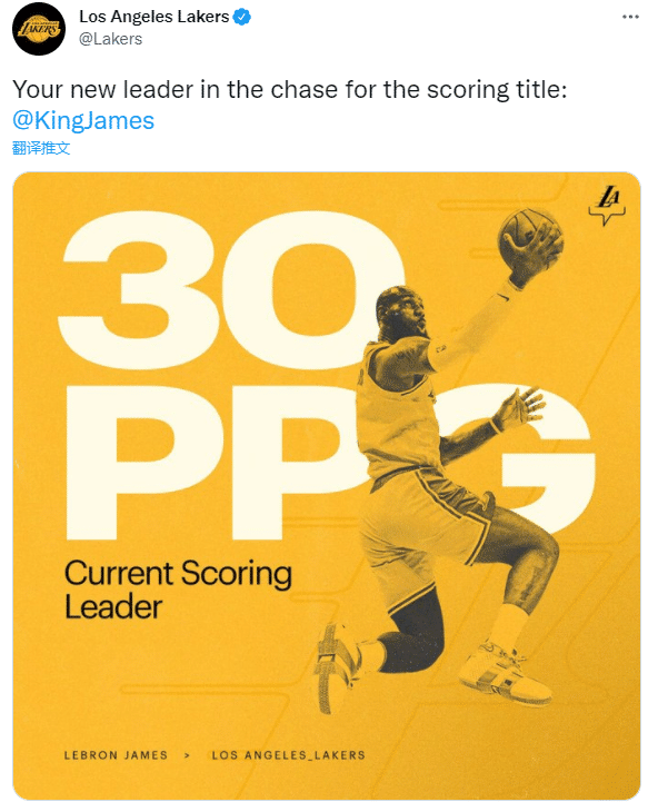 来源:JRS直播网03-23 09:31JRS直播网03月23日讯 湖人官方为詹姆斯冲击得分王造势,晒出詹姆斯场均30分领跑联盟,发推写道:詹姆斯是得分王之争新的领头羊;若37岁詹姆斯夺得本赛季得分王,他将创造新的历史,成为史上最年老得分王。