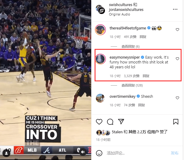 此前美媒swishcultures晒出詹姆斯昨日对阵骑士轰下38分12助攻11篮板的比赛集锦,杜兰特在评论区盛赞老詹,写道:相当轻松。有趣的是,这家伙看着48岁了,打球依旧如此丝滑,哈哈。