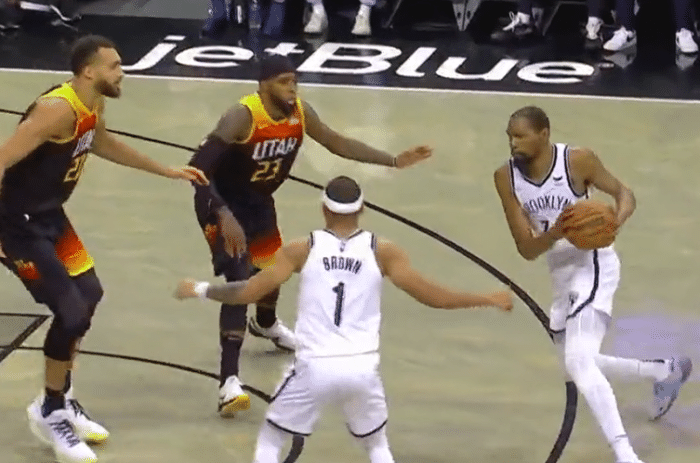 第三节的比赛开始后,德拉季奇抛投不中,克拉克斯顿抢到篮板补扣得手,戈贝尔篮下单打,克拉克斯顿送出精彩盖帽,随后的进攻,杜兰特送妙传,克拉克斯顿隔扣戈贝尔,克拉克斯顿一攻一防点燃了全场气氛,布朗强突上篮命中,并且造成了犯规,杜兰特布朗连续命中三分球,这一节的比赛篮网进攻端杀疯了,克拉克斯顿篮下单打戈贝尔打中并且造成了犯规,一波19-6的小高潮,篮网拉开了比分,单节比赛篮网轰出了38:24的比分,三节打完篮网领先16分。