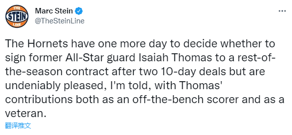 据名记Stein报道,黄蜂对于老将后卫以赛亚-托马斯的表现感到满意,预计将与其签约至本赛季结束;小刺客的出色表现让球队满意,也让乔老板满意,出战6场,场均9分战绩是5胜1负。