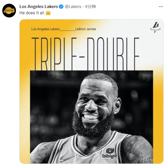 末节,詹姆斯带队打出12-2反击波,得分和助攻同时抓,早早拿到三双,湖人官方祝贺并且盛赞詹姆斯做到了一切;关键时刻,詹姆斯强硬上篮,杀到内线暴扣以及高难度后仰跳投,连续3球打得骑士放弃比赛。
