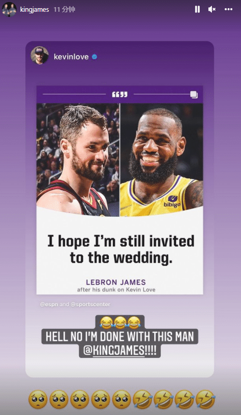 乐福转发詹姆斯想参加婚礼的采访言论,配文调侃写道:不,我们之间的关系彻底玩完了(三个笑哭的表情);詹姆斯回应委屈快哭了和笑哭表情。