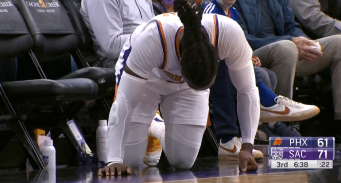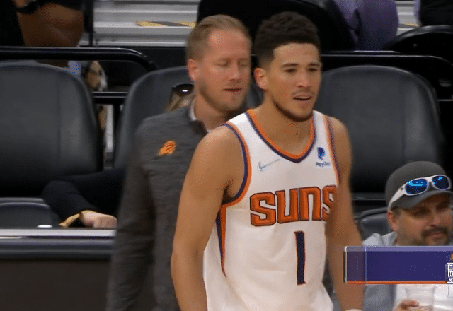 本场比赛,国王一度领先到两位数,但太阳疯狂反扑,布克第三节大爆发,单节独砍19分杀疯了,不过布克早早吃到第5犯,试图向裁判申诉却遭无视,布克只能无奈下场;此节克劳德被垫脚而痛苦倒地,一瘸一拐离场,之后再也没有上场。