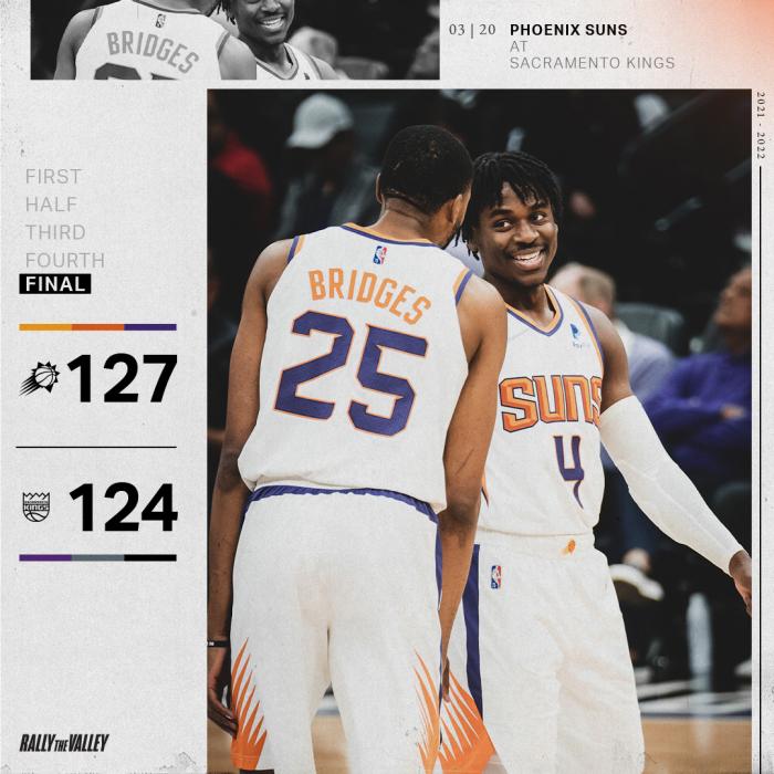 末节关键时刻,艾顿六犯毕业,布克投进关键两分,国王米切尔上篮追平比赛,布克错失三分绝杀,两队打进加时赛;加时赛麦基和布克先后六犯毕业,生死时刻沙梅特投进制胜三分,最终太阳客场逆转赢球,赛后保罗、布克等人都拥抱沙梅特庆祝。