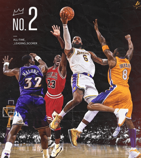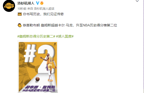 很快湖人官方在第一时间送上祝贺: 你书写历史,我们见证传奇 恭喜勒布朗·詹姆斯超越卡尔·马龙,升至NBA历史得分榜第二位。