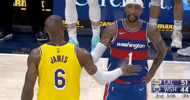 当詹姆斯达成里程碑时刻的时候,全场球迷起立鼓掌,詹姆斯也进行回应,他和身旁的前队友波普击掌。
