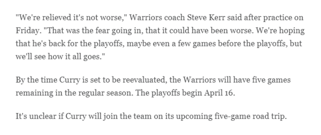“我们松了一口气,情况并没有变得更糟糕,”科尔在今天训练后的采访里说道,“那是一种恐惧感,因为它可能会更糟。我们希望他能回来打季后赛,甚至是季后赛开始前的几场比赛中复出。”目前,还不清楚库里是否会随队参加即将到来的五连客之旅。