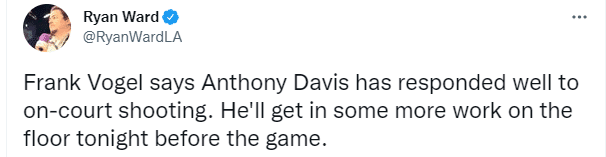 浓眉已经参加投篮训练,赛后浓眉在多伦多进行了训练,运球和投篮一气呵成,这意味着他的脚踝伤势已经恢复的很好;对于浓眉的情况,沃格尔表示:戴维斯在回归训练后度过了美好的一周,他现在正继续自己的投篮训练,而且情况每天都在好转,总体而言,本周他非常有收获。