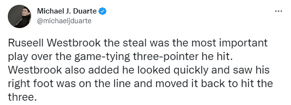 威少表示抢断并且投进绝杀三分是他生涯最重要的一场比赛,威少还透露他迅速看了看脚,发现自己的右脚踩在线上,于是将右脚向后移动然后投进三分。