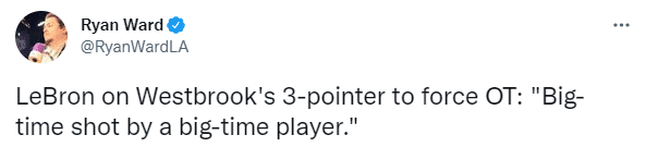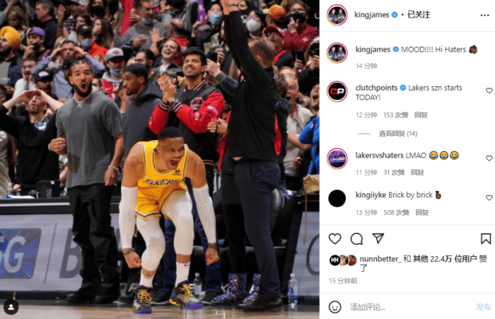 来源:JRS直播网03-19 15:20JRS直播网03月19日讯 北京时间3月19日,赛后,詹姆斯谈到威少绝平三分把比赛拖进加时赛,直言:这是一个大场面的球员(威少)的致命一击;另外湖人赢球赛后,詹姆斯第一时间晒出威少握拳怒吼的庆祝照,并且在Ins上配文写道:心情,你好,黑子们。威少还透露接受采访前,他的爱妻给他看了詹姆斯力挺自己的动态。