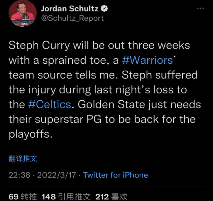值得一提的是在稍早前,据美媒记者Jordan Schultz报道,一位勇士队内消息人士告知他,库里因脚趾扭伤预计将缺阵3周时间。