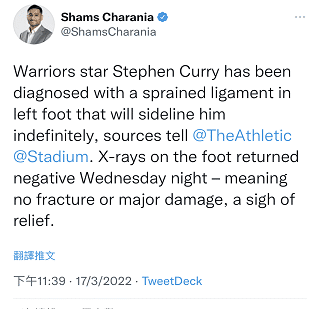 来源:JRS直播网03-18 11:40JRS直播网03月18日讯 受伤的库里传来最新的消息,这是根据Shams的报道显示,库里左脚韧带扭伤,无限期缺阵,不过昨晚的X光检查确认没有骨折或任何重大损伤。
