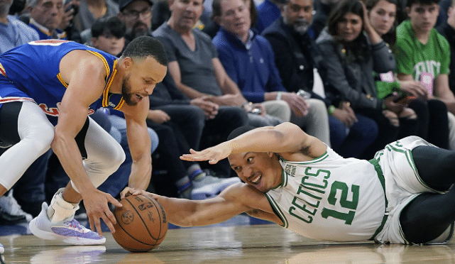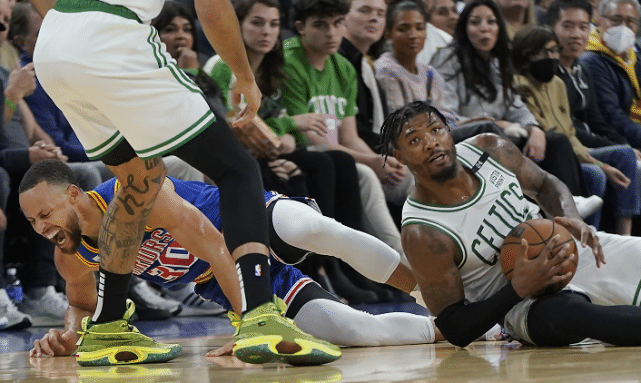 库里是在对阵凯尔特人的第2节比赛中受伤的,当时是一次争抢球权的过程当中,斯马特倒地救球压在了库里的脚上,之后追防又踢到了汤普森。库里在回防过程中已经一瘸一拐,之后他回到了更衣室检查伤势。