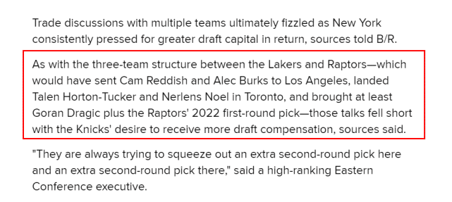 当时,这三支球队谈过这样一个交易框架:雷迪什、伯克斯去湖人,塔克、诺埃尔去猛龙,德拉季奇和猛龙的2022首轮签去尼克斯。费舍尔透露,由于尼克斯索要更多的选秀补偿,这笔交易谈判最终告吹。一位东部的高管表示:“他们(尼克斯)总想索要一个额外的次轮签,不管什么交易都是这样。”正是这样不断索取选秀签,让尼克斯谈崩了不少交易。