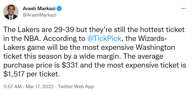 来源:JRS直播网03-17 16:47JRS直播网03月17日讯 ,湖人虽然状态低迷,只有29胜39负,但他们依然是NBA最热门的球队之一。据记者Arash Markazi报道,20日湖人造访华盛顿,对阵奇才比赛票价为本赛季奇才主场的最高票价,本场比赛平均票价为331美元,其中最高票价为1517美元。