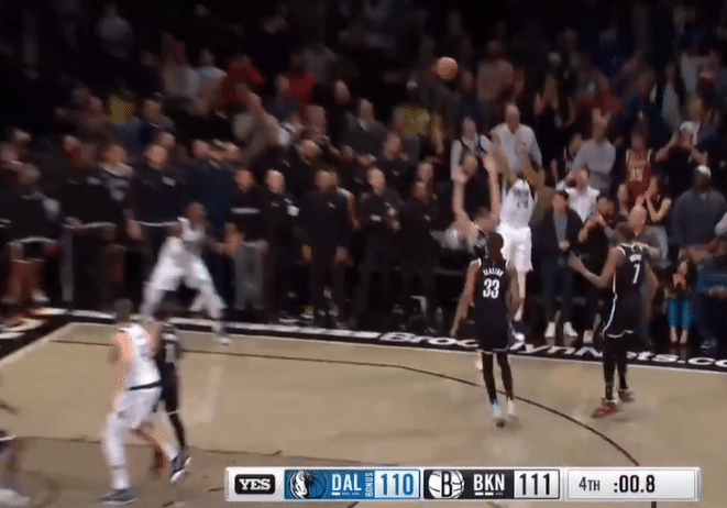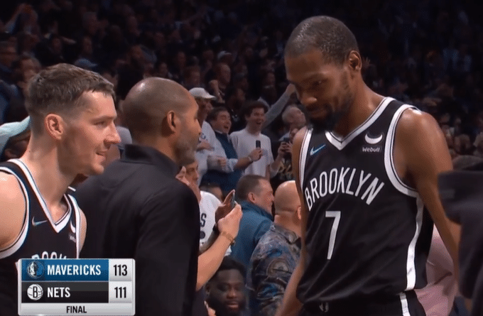 直接回到本场比赛的最后时刻,东契奇和杜兰特交相辉映。东契奇利用连续的后仰跳投得分,帮助独行侠上分。最后1分钟,东契奇面对德拉季奇再度中投得分,独行侠110-108领先2分。但随后杜兰特亮出死神镰刀,面对补防夹击,杜兰特直接跳起出手三分,皮球落入篮筐。终场前10秒,篮网111-110反超。