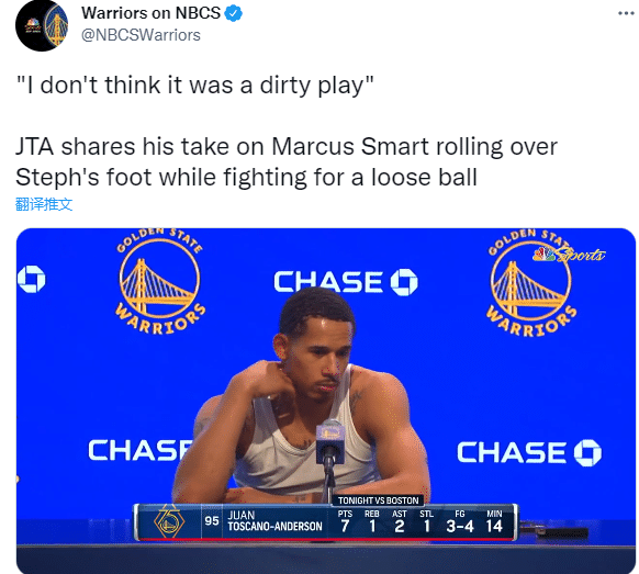 赛后谈到库里受伤,追梦格林表示:“我希望马库斯-斯玛特在球场上打得很努力,我不能说今晚的比赛很肮脏,但他的那个飞扑动作可能是没有必要的。