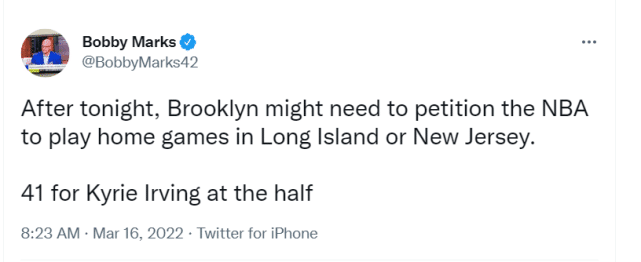 上半场,欧文就得到41分,19投14中,三分7投6中,罚球7罚7中。显然是为了成全欧文创造纪录,杜兰特第二节干脆没有出手。专家鲍比-马克斯建议篮网在这场比赛后申请搬主场到新泽西或者长岛,这样就能让欧文出战主场比赛了。