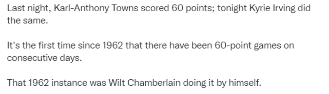 14.唐斯昨天60分,欧文今天60分,这是1962年以来首次连续两天有60分+的表现,而1962年张伯伦一个人做到这一点。