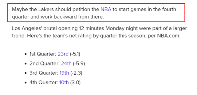 来源:JRS直播网03-16 15:37JRS直播网讯 北京时间3月16日,美媒调侃湖人应该向联盟申请,比赛只打第四节。当然调侃归调侃,美媒也表示记分牌在第一节后不会重置,湖人在垃圾时间超越对手也毫无意义。霍顿-塔克和威少在昨天的赛后采访都表示,不知道为什么湖人总是慢热。