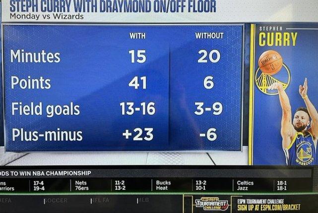 库里昨天一共打了35分钟,和追梦同场的15分钟,库里轰下41分,投篮16中13,正负值+23;而不和追梦同场的20分钟,库里只得到6分,投篮9中3,正负值是-6。追梦和库里已经是多年队友,实在太熟悉库里了,而他在场时,攻防两端都能为库里减压。特别是进攻端,他常常能为库里创造很好的得分机会。