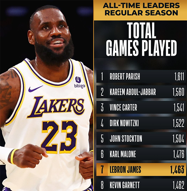 这场比赛詹姆斯迎来里程碑,首发出战湖勇大战的他生涯第1463场常规赛,出场数超越加内特,升至NBA历史第七位。