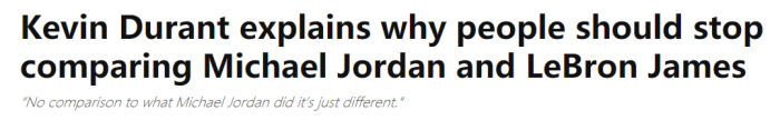 杜兰特解释为什么应该停止对比乔丹和詹姆斯,他表示:和乔丹所达成的成就比起来,一切都是小巫见大巫;这种比较不是说,乔丹是一,詹姆斯是二那种,他们俩都是我们以前从来没有见过的类型的球员,他们两个人都是独一无二的,在两个不同的领域中,他们都是很伟大的球员。