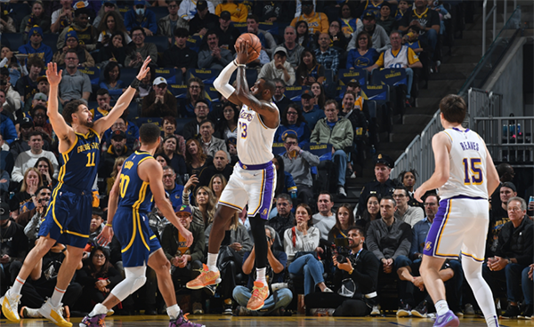 湖人和勇士本赛季第一次交手,詹姆斯的手感火热,开场三连中,之后在反击中单手劈扣,第一节6中4拿到9分;第二节湖勇仍旧打得十分胶着,上半场最后时刻,还剩52秒,库明加搂抱放倒詹姆斯,科尔挑战失败,老詹两罚全中,之后詹姆斯命中快速三分,上半场最后一攻,詹姆斯单挑库里命中后仰中投,压哨命中后,和拉塞尔一起直接跑回更衣室。
