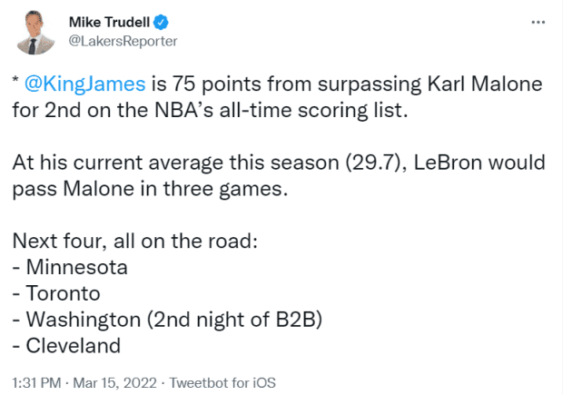 来源:JRS直播网03-15 16:33JRS直播网03月15日讯 ,湖人103-114不敌猛龙,詹姆斯得到30分。赛后,湖人记者报道称,詹姆斯距离超越卡尔-马龙只差75分了。詹姆斯目前场均29.7分,以这样的速度,有望在三场比赛左右完成超越。湖人接下来的4场比赛都在客场,对手依次是森林狼、猛龙、奇才和骑士。詹姆斯目前生涯总得分36854分,马龙是36928分。
