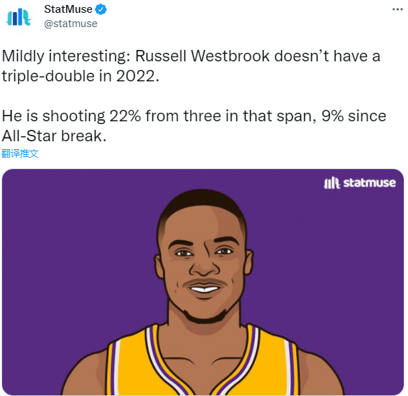 美媒StatMuse更新动态,晒出了湖人球星威斯布鲁克本赛季的两项扎心数据,一是威少2022年以来还未斩获过三双,二是威少今年的三分命中率是22%,而自从全明星间歇期以来这一数据是9%。