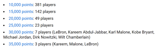 NBA官方给出数据, 历史上累计有381名球员至少得到10000分,142名球员至少15000分,49名球员至少20000分,23名球员至少25000分,7名球员至少30000分,只有3名球员至少35000分(贾巴尔、马龙和詹姆斯)。詹姆斯不但解锁了上述的每一级金字塔,而且创造了解锁每一级的最年轻纪录。