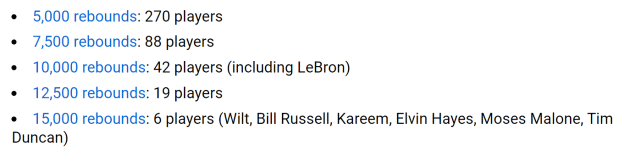 NBA官方给出数据,目前有270名球员至少抢到5000个篮板,88名球员至少拿到7500个篮板,42名球员(包括詹姆斯)至少拿到10000个篮板,19名球员至少12500个篮板,只有6名球员至少15000个篮板。