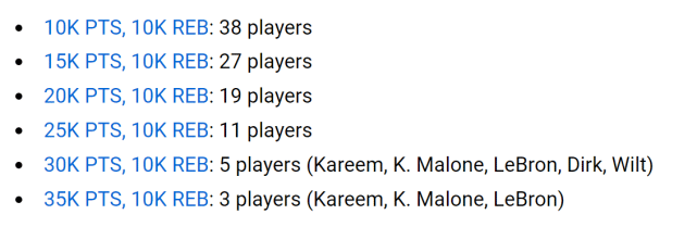 詹姆斯和贾巴尔是仅有的两位在得分、助攻和篮板三个类别中都进入前 50 名的球员。勒布朗得分第3,助攻第7,篮板第39;贾巴尔得分第1,篮板第3,助攻第 45。