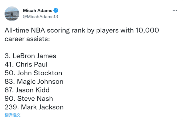 据美媒adams统计,在7名助攻破万的球员中,只有詹姆斯的生涯总得分杀入了历史前10,暂时排在第3,登顶历史得分王只是时间问题。而排名第二的保罗总得分只排在历史第41位,斯托克顿得分排第50,魔术师约翰逊第83,基德第87,纳什第90,马克杰克逊得分则只排在历史第239位。