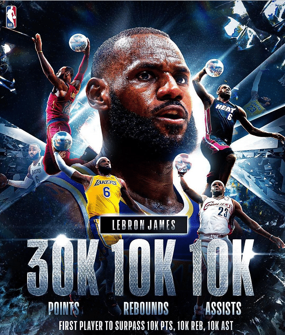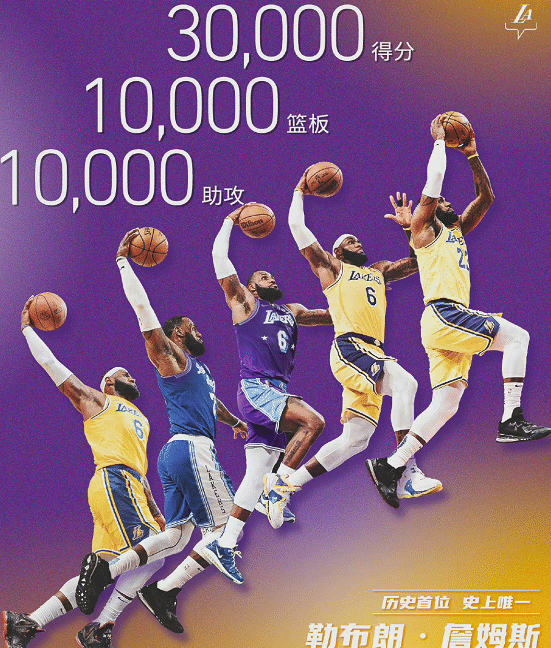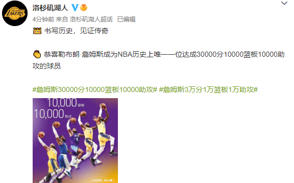 湖人官方也送上祝福:书写历史,见证传奇,恭喜勒布朗·詹姆斯成为NBA历史上唯一一位达成30000分10000篮板10000助攻的球员。